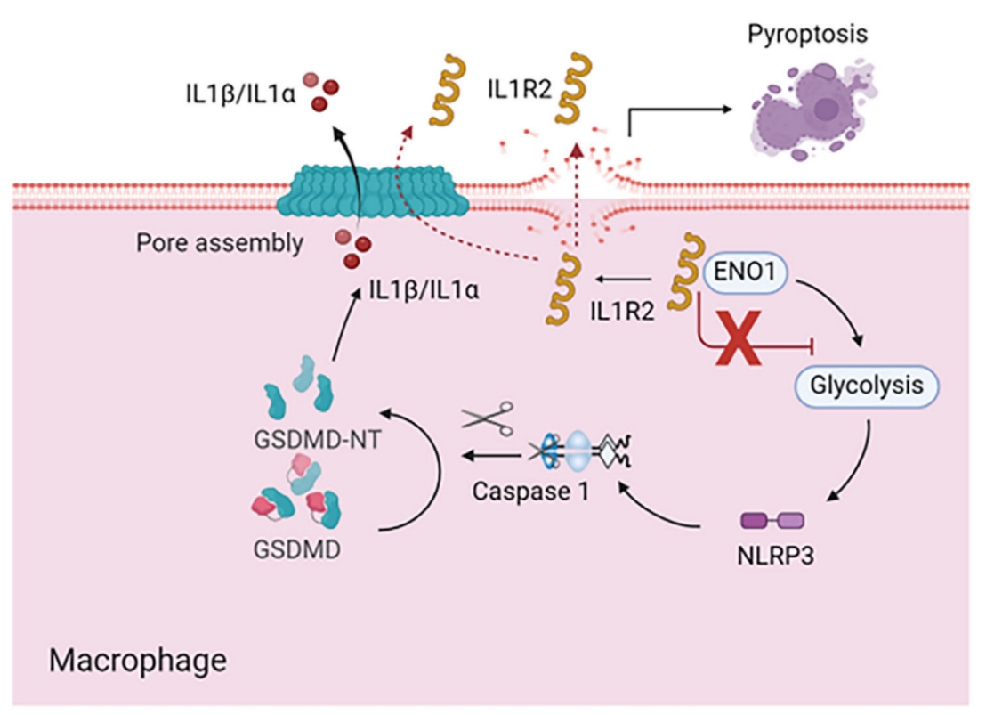 脓毒症是宿主对感染的反应失调而导致危及生命的器官功能障碍,是ICU患者死亡的主要原因之一。团队前期通过临床样本分析发现,脓毒症患者血浆中可溶性诱饵受体IL1R2水平显著升高。进一步实验证实,这一关键分子能够与糖酵解限速酶ENO1直接结合,通过抑制巨噬细胞的糖酵解通路,阻断GSDMD介导的细胞焦亡及后续炎症风暴。动物实验显示,IL1R2基因敲除小鼠表现出更严重的器官损伤和死亡率,而ENO1抑制剂则可显著改善脓毒症预后。该研究创新性地阐明了诱饵受体IL1R2的新功能,通过IL1R2-ENO1互作调控能量代谢和细胞焦亡进而干预脓毒症的进程,为这一临床危重症提供了潜在治疗靶点。