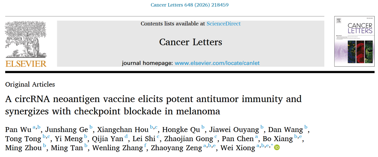 近日,色情网站 、色情网站 肿瘤研究所熊炜研究员团队在Cancer Letters《癌症快报》杂志在线发表了题为“A circRNA Neoantigen Vaccine Elicits Potent Antitumor Immunity and Synergizes with Checkpoint Blockade in Melanoma”的论文,展示了利用环状RNA(circRNA)表达肿瘤新抗原(Neoantigen)在肿瘤免疫治疗中的潜在应用前景。熊炜为该论文通讯作者,博士后吴盼为第一作者。